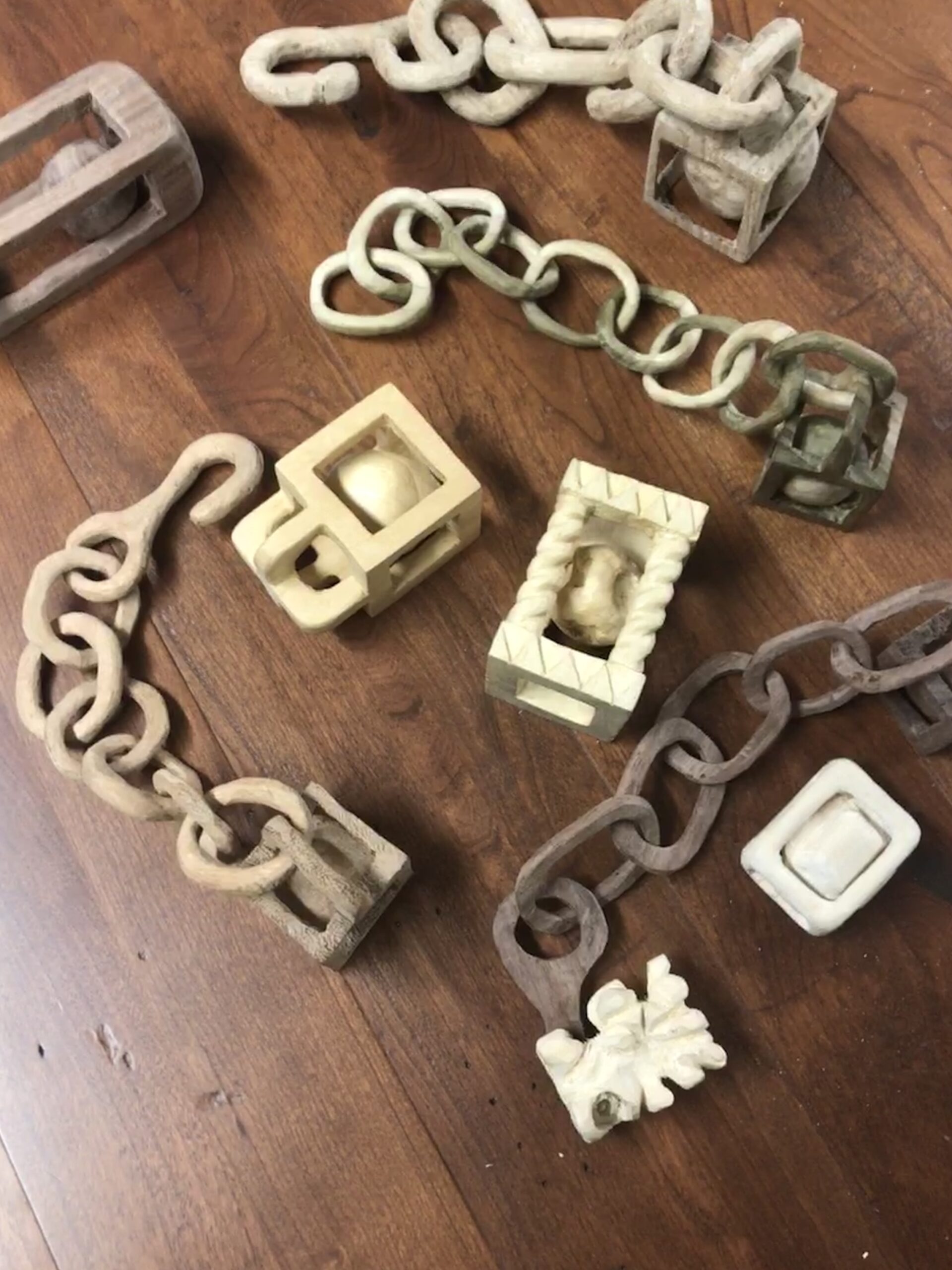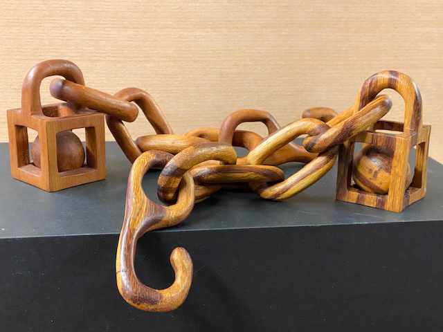 Two wood chains one is made of maple and the other of exotic marble wood. Both carved from one piece of wood.