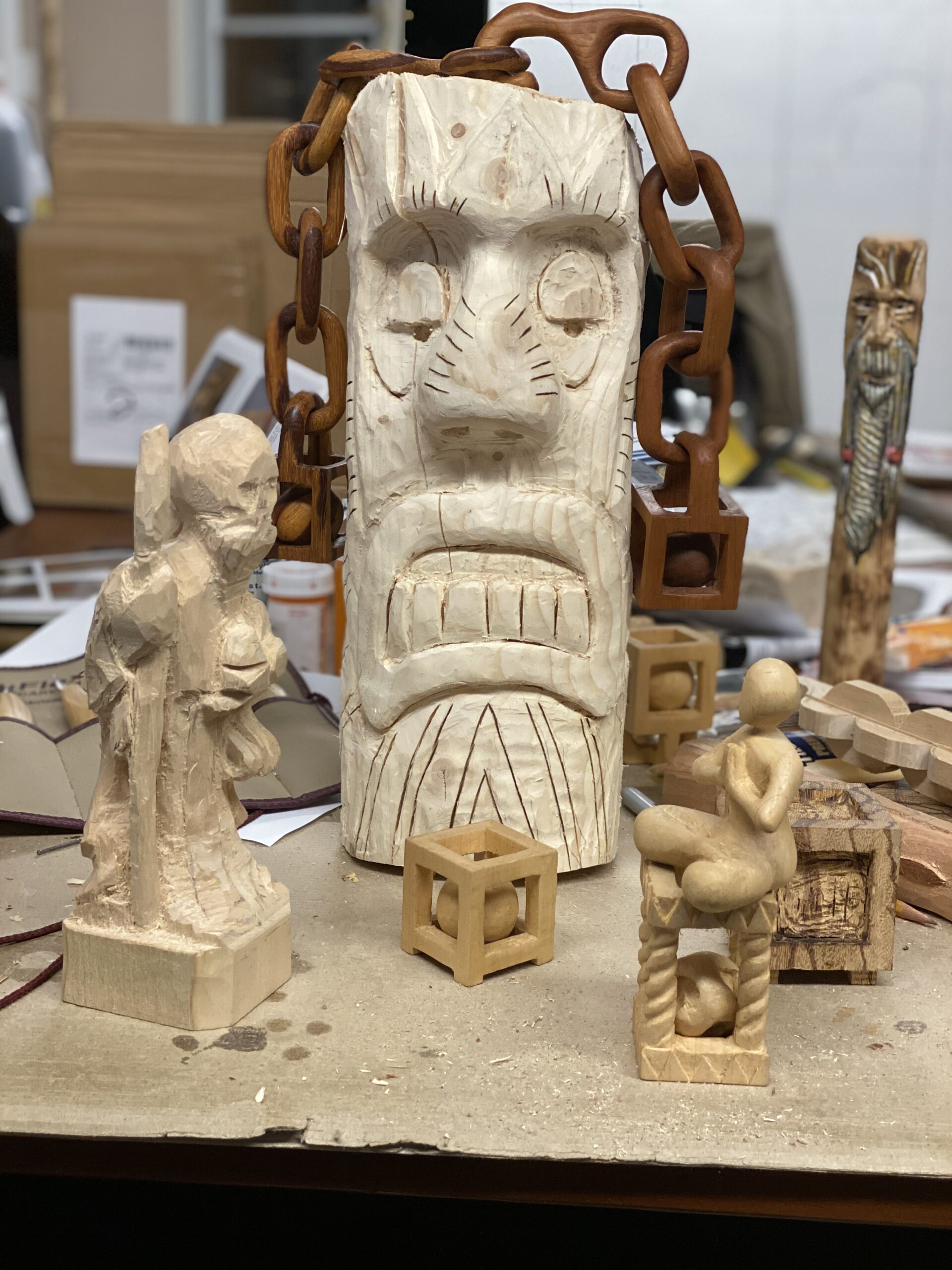 I got into wood carving as a boy scout. My father was our scout master. He carved neckerchief slides. It looked like fun so I became his apprentice. He also carved a number of wooden balls on a wooden chain. They always fascinated me but they were more complicated than anything I did. Years after he passed I found one he started; it had three links on it and it hung from a nail in the basement. As I held that chunk of wood in my hands – with the three carved links – a voice from my childhood spoke to me and I finished the chain and ball. That was about 2005 when I refreshed my boyhood carving skills for a brief moment. Years later I started up again and here’s the result.Â