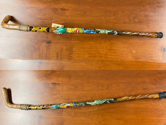 I was trimming some dead branches off a tree in our yard when noticing a branch and received the image of a cane. The handle was from a piece of drift wood that was laying in our yard for years – it worked out great.